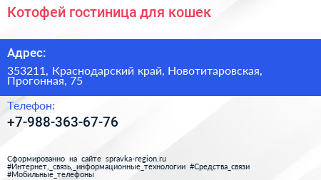 Котофей, гостиница для кошек по адресу 353211, Краснодарский край, Новотитаровская, Прогонная, 75 в дальнейшем Организация, размещена в следующих категориях: