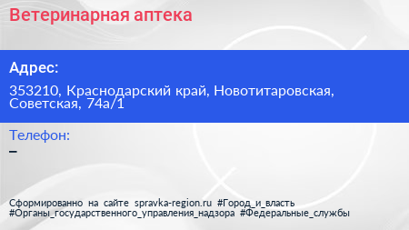 Ветеринарная аптека по адресу 353210, Краснодарский край, Новотитаровская, Советская, 74а/1 в дальнейшем Организация, размещена в следующих категориях: