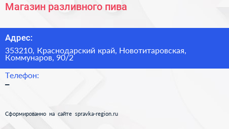 Магазин разливного пива по адресу 353210, Краснодарский край, Новотитаровская, Коммунаров, 90/2 в дальнейшем Организация, размещена в следующих категориях:
