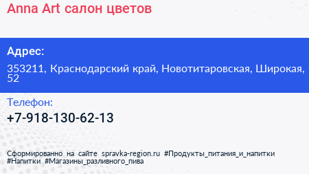 Anna Art, салон цветов по адресу 353211, Краснодарский край, Новотитаровская, Широкая, 52 в дальнейшем Организация, размещена в следующих категориях:
