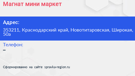 Магнат, мини-маркет по адресу 353211, Краснодарский край, Новотитаровская, Широкая, 50а в дальнейшем Организация, размещена в следующих категориях:
