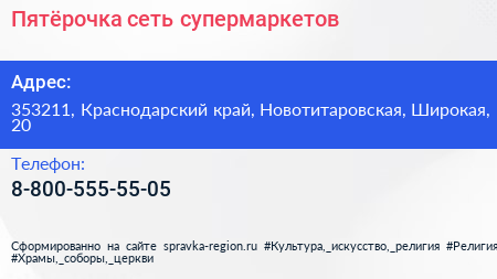 Пятёрочка, сеть супермаркетов по адресу 353211, Краснодарский край, Новотитаровская, Широкая, 20 в дальнейшем Организация, размещена в следующих категориях: