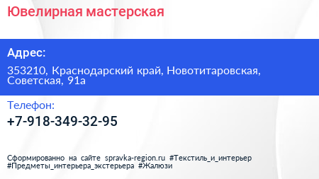 Ювелирная мастерская по адресу 353210, Краснодарский край, Новотитаровская, Советская, 91а в дальнейшем Организация, размещена в следующих категориях: