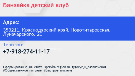 Банзайка, детский клуб по адресу 353211, Краснодарский край, Новотитаровская, Луначарского, 20 в дальнейшем Организация, размещена в следующих категориях: