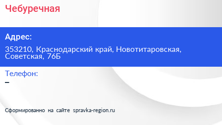 Чебуречная по адресу 353210, Краснодарский край, Новотитаровская, Советская, 76Б в дальнейшем Организация, размещена в следующих категориях: