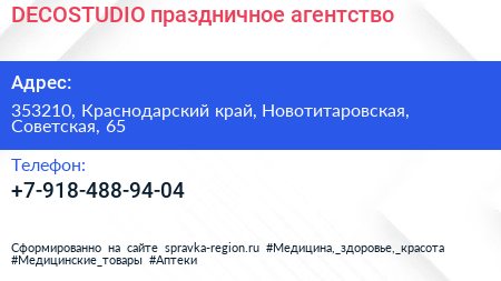 DECOSTUDIO, праздничное агентство по адресу 353210, Краснодарский край, Новотитаровская, Советская, 65 в дальнейшем Организация, размещена в следующих категориях: