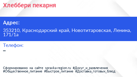 Хлеббери, пекарня по адресу 353210, Краснодарский край, Новотитаровская, Ленина, 171/1а в дальнейшем Организация, размещена в следующих категориях: