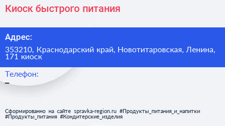 Киоск быстрого питания по адресу 353210, Краснодарский край, Новотитаровская, Ленина, 171 киоск в дальнейшем Организация, размещена в следующих категориях: