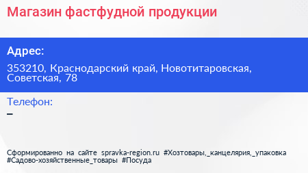 Магазин фастфудной продукции по адресу 353210, Краснодарский край, Новотитаровская, Советская, 78 в дальнейшем Организация, размещена в следующих категориях:
