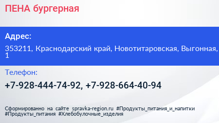 ПЕНА, бургерная по адресу 353211, Краснодарский край, Новотитаровская, Выгонная, 1 в дальнейшем Организация, размещена в следующих категориях: