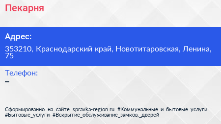 Пекарня по адресу 353210, Краснодарский край, Новотитаровская, Ленина, 75 в дальнейшем Организация, размещена в следующих категориях: