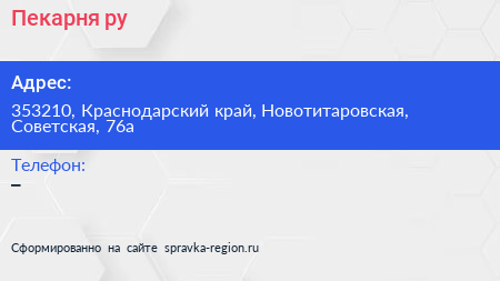 Пекарня.ру по адресу 353210, Краснодарский край, Новотитаровская, Советская, 76а в дальнейшем Организация, размещена в следующих категориях: