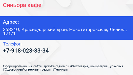 Синьора, кафе по адресу 353210, Краснодарский край, Новотитаровская, Ленина, 171/1 в дальнейшем Организация, размещена в следующих категориях: