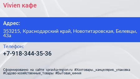 Vivien, кафе по адресу 353215, Краснодарский край, Новотитаровская, Белевцы, 43а в дальнейшем Организация, размещена в следующих категориях: