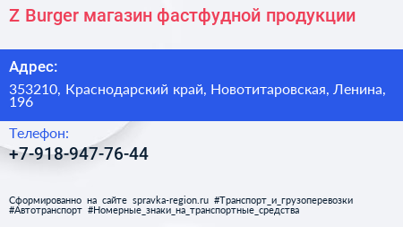 Z-Burger, магазин фастфудной продукции по адресу 353210, Краснодарский край, Новотитаровская, Ленина, 196 в дальнейшем Организация, размещена в следующих категориях: