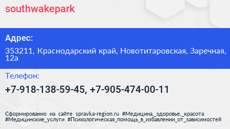 southwakepark по адресу 353211, Краснодарский край, Новотитаровская, Заречная, 12а в дальнейшем Организация, размещена в следующих категориях: