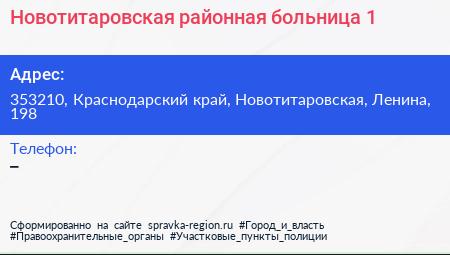 Новотитаровская районная больница №1 по адресу 353210, Краснодарский край, Новотитаровская, Ленина, 198 в дальнейшем Организация, размещена в следующих категориях: