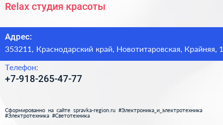 Relax, студия красоты по адресу 353211, Краснодарский край, Новотитаровская, Крайняя, 1 в дальнейшем Организация, размещена в следующих категориях: