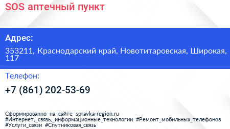 SOS, аптечный пункт по адресу 353211, Краснодарский край, Новотитаровская, Широкая, 117 в дальнейшем Организация, размещена в следующих категориях: