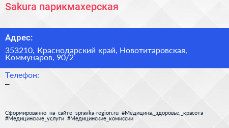 Sakura, парикмахерская по адресу 353210, Краснодарский край, Новотитаровская, Коммунаров, 90/2 в дальнейшем Организация, размещена в следующих категориях:
