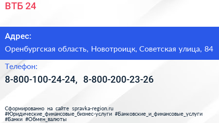 ВТБ 24 по адресу Оренбургская область, Новотроицк, Советская улица, 84 в дальнейшем Организация, размещена в следующих категориях: