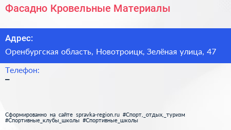Фасадно-Кровельные Материалы по адресу Оренбургская область, Новотроицк, Зелёная улица, 47 в дальнейшем Организация, размещена в следующих категориях: