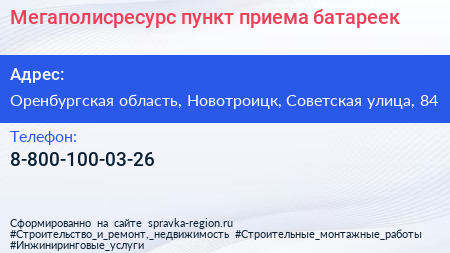 Мегаполисресурс, пункт приема батареек по адресу Оренбургская область, Новотроицк, Советская улица, 84 в дальнейшем Организация, размещена в следующих категориях: