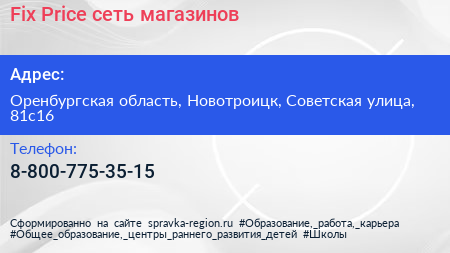 Fix Price, сеть магазинов по адресу Оренбургская область, Новотроицк, Советская улица, 81с16 в дальнейшем Организация, размещена в следующих категориях:
