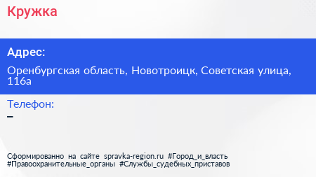 Кружка по адресу Оренбургская область, Новотроицк, Советская улица, 116а в дальнейшем Организация, размещена в следующих категориях: