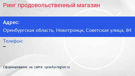 Ринг, продовольственный магазин по адресу Оренбургская область, Новотроицк, Советская улица, 84 в дальнейшем Организация, размещена в следующих категориях: