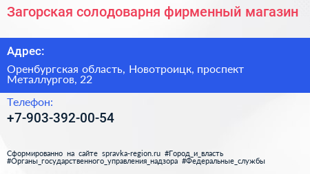 Загорская солодоварня, фирменный магазин по адресу Оренбургская область, Новотроицк, проспект Металлургов, 22 в дальнейшем Организация, размещена в следующих категориях: