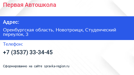 Первая Автошкола по адресу Оренбургская область, Новотроицк, Студенческий переулок, 3 в дальнейшем Организация, размещена в следующих категориях: