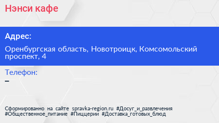 Нэнси, кафе по адресу Оренбургская область, Новотроицк, Комсомольский проспект, 4 в дальнейшем Организация, размещена в следующих категориях: