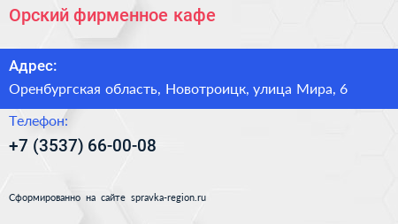 Орский, фирменное кафе по адресу Оренбургская область, Новотроицк, улица Мира, 6 в дальнейшем Организация, размещена в следующих категориях: