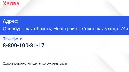 Халва по адресу Оренбургская область, Новотроицк, Советская улица, 74а в дальнейшем Организация, размещена в следующих категориях: