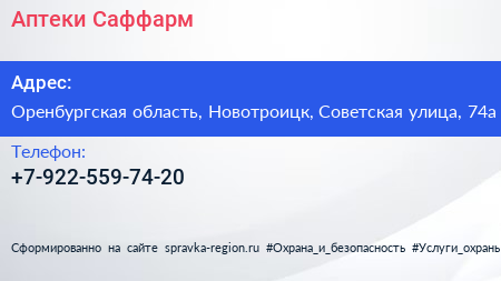 Аптеки Саффарм по адресу Оренбургская область, Новотроицк, Советская улица, 74а в дальнейшем Организация, размещена в следующих категориях: