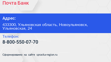 Почта Банк по адресу 433300, Ульяновская область, Новоульяновск, Ульяновская, 24 в дальнейшем Организация, размещена в следующих категориях: