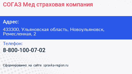 СОГАЗ-Мед, страховая компания по адресу 433300, Ульяновская область, Новоульяновск, Ремесленная, 2 в дальнейшем Организация, размещена в следующих категориях: