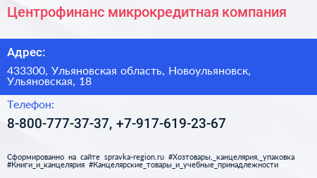 Центрофинанс, микрокредитная компания по адресу 433300, Ульяновская область, Новоульяновск, Ульяновская, 18 в дальнейшем Организация, размещена в следующих категориях:
