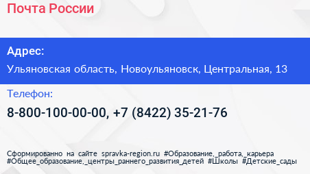 Почта России по адресу Ульяновская область, Новоульяновск, Центральная, 13 в дальнейшем Организация, размещена в следующих категориях: