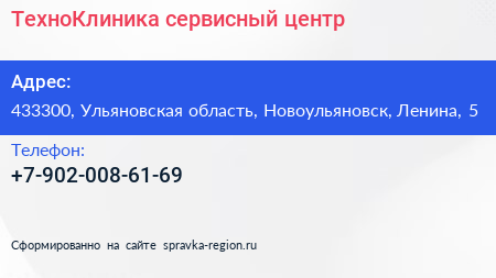 ТехноКлиника, сервисный центр по адресу 433300, Ульяновская область, Новоульяновск, Ленина, 5 в дальнейшем Организация, размещена в следующих категориях: