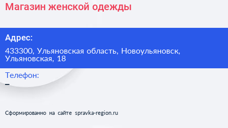 Магазин женской одежды по адресу 433300, Ульяновская область, Новоульяновск, Ульяновская, 18 в дальнейшем Организация, размещена в следующих категориях:
