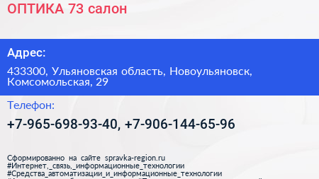 ОПТИКА 73, салон по адресу 433300, Ульяновская область, Новоульяновск, Комсомольская, 29 в дальнейшем Организация, размещена в следующих категориях: