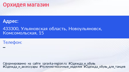 Орхидея, магазин по адресу 433300, Ульяновская область, Новоульяновск, Комсомольская, 15 в дальнейшем Организация, размещена в следующих категориях:
