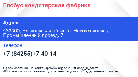 Глобус, кондитерская фабрика по адресу 433300, Ульяновская область, Новоульяновск, Промышленный проезд, 7 в дальнейшем Организация, размещена в следующих категориях: