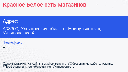 Красное & Белое, сеть магазинов по адресу 433300, Ульяновская область, Новоульяновск, Ульяновская, 4 в дальнейшем Организация, размещена в следующих категориях: