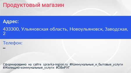 Продуктовый магазин по адресу 433300, Ульяновская область, Новоульяновск, Заводская, 2 в дальнейшем Организация, размещена в следующих категориях: