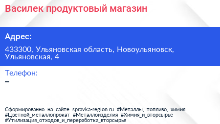 Василек, продуктовый магазин по адресу 433300, Ульяновская область, Новоульяновск, Ульяновская, 4 в дальнейшем Организация, размещена в следующих категориях: