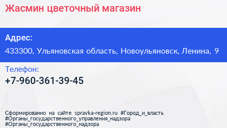 Жасмин, цветочный магазин по адресу 433300, Ульяновская область, Новоульяновск, Ленина, 9 в дальнейшем Организация, размещена в следующих категориях: