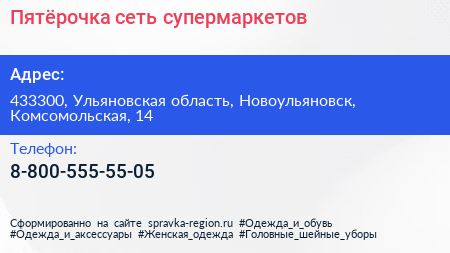 Пятёрочка, сеть супермаркетов по адресу 433300, Ульяновская область, Новоульяновск, Комсомольская, 14 в дальнейшем Организация, размещена в следующих категориях: